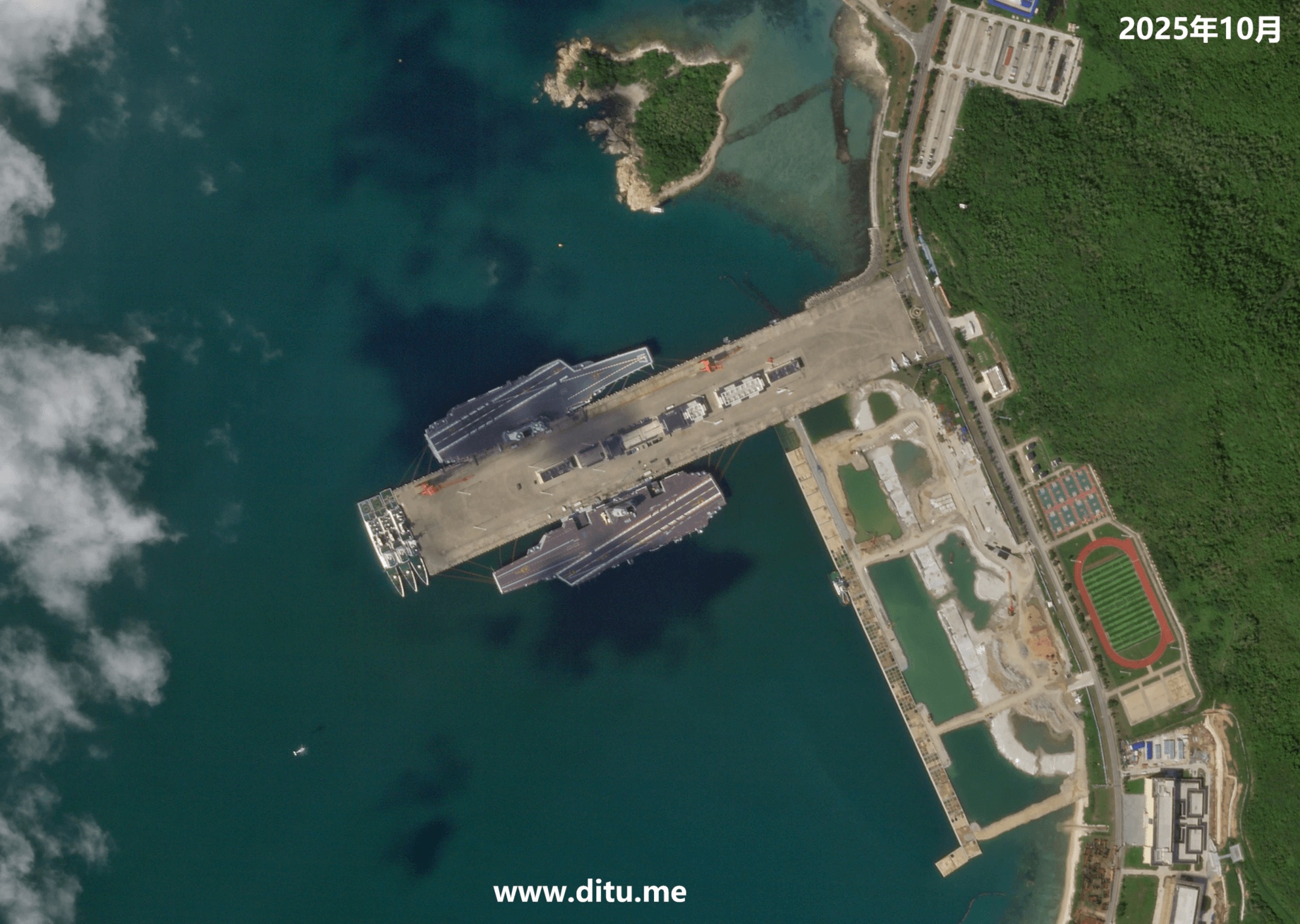 2025年10月停靠在三亚军港的福建舰和山东舰卫星影像 时间: 2025-11-07 分类: 地图资料 卫星图像拍摄日期:2025年10月8日卫星图像来源:美联社 Planet Labs PBC中国航空母舰山东号和福建号停泊在海南三亚附近的榆林海军基地。