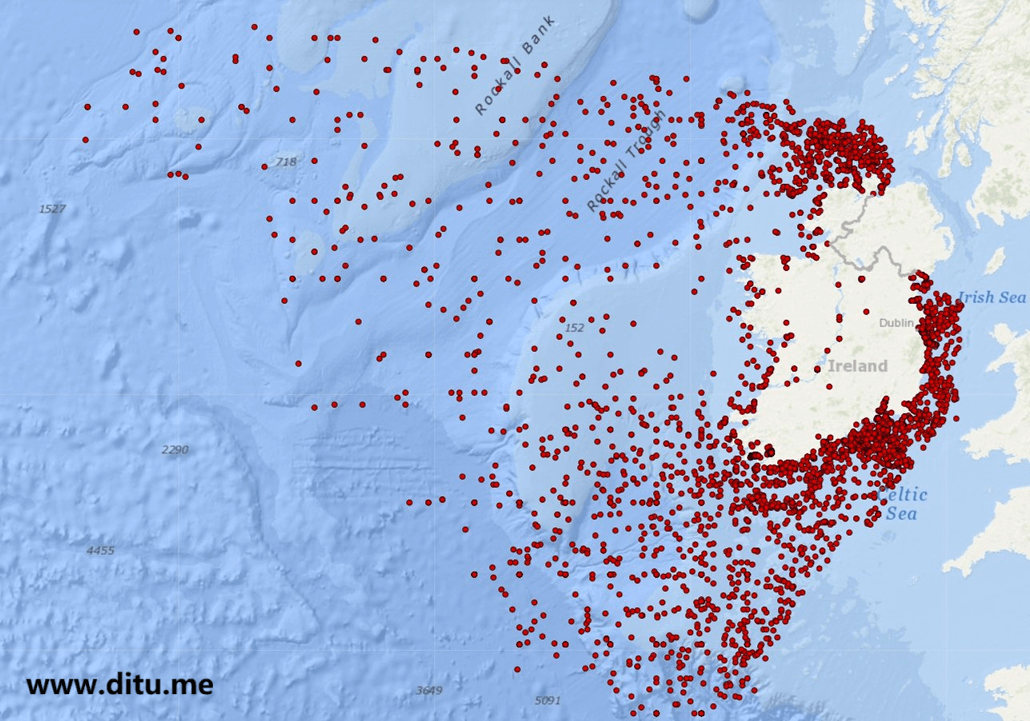 上图是自1530年以来,爱尔兰附近海域有记录的沉船事故发生地点分布地图。