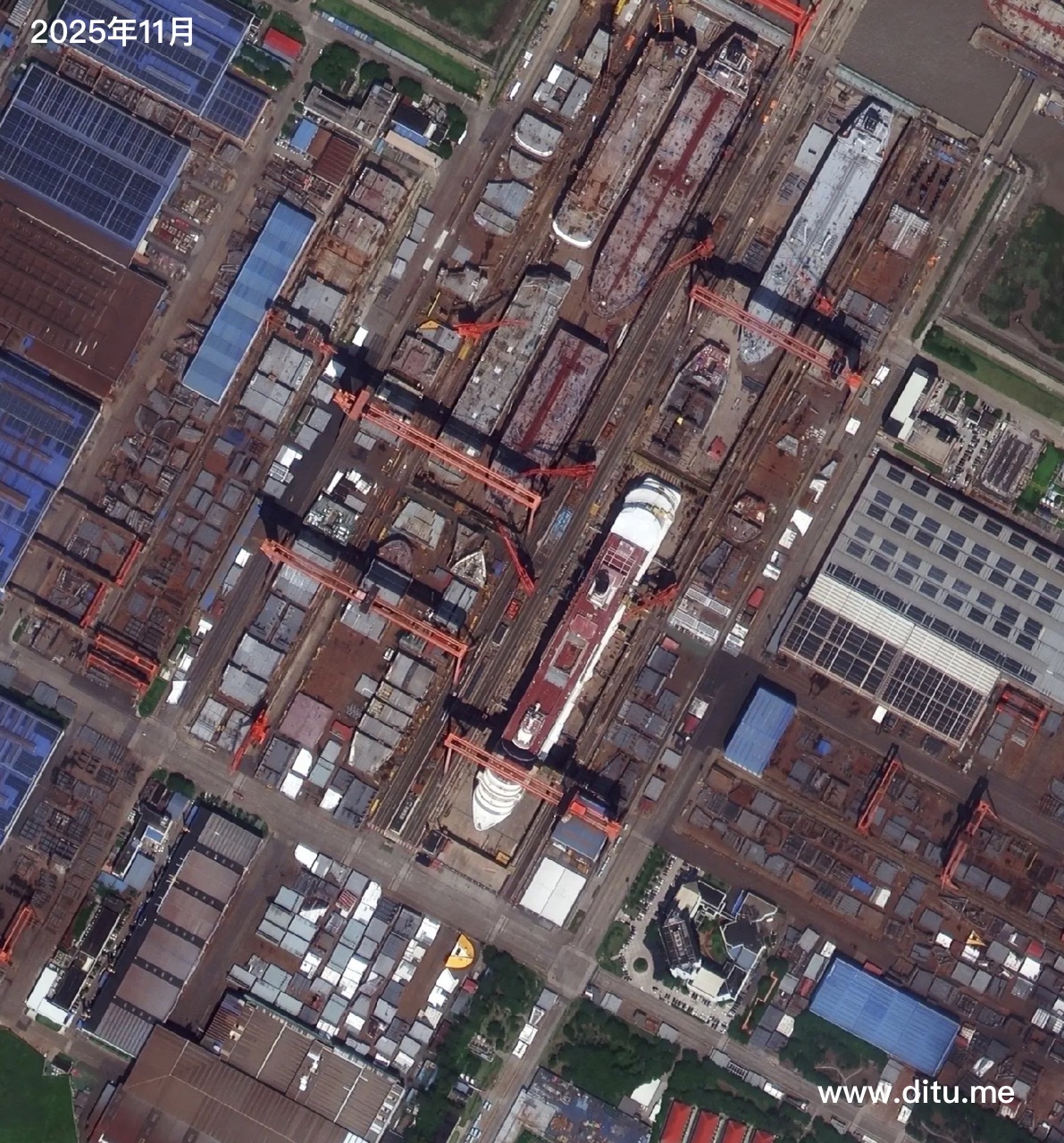 上海外高桥造船有限公司最新卫星影像 时间: 2026-03-01 分类: 地图资料 卫星图像拍摄时间:2025年11月。外高桥造船,是中国船舶工业集团旗下的核心造船企业,被誉为“中国第一船厂”。它因成功建造国产大型邮轮,帮助中国船舶工业摘取了“皇冠上的最后一颗明珠”而闻名于世。