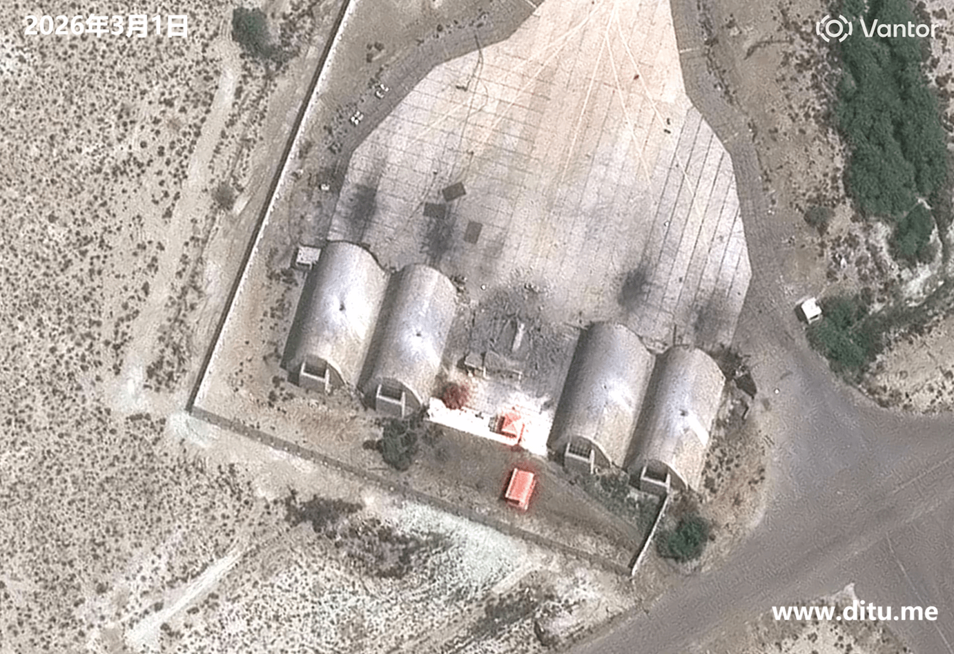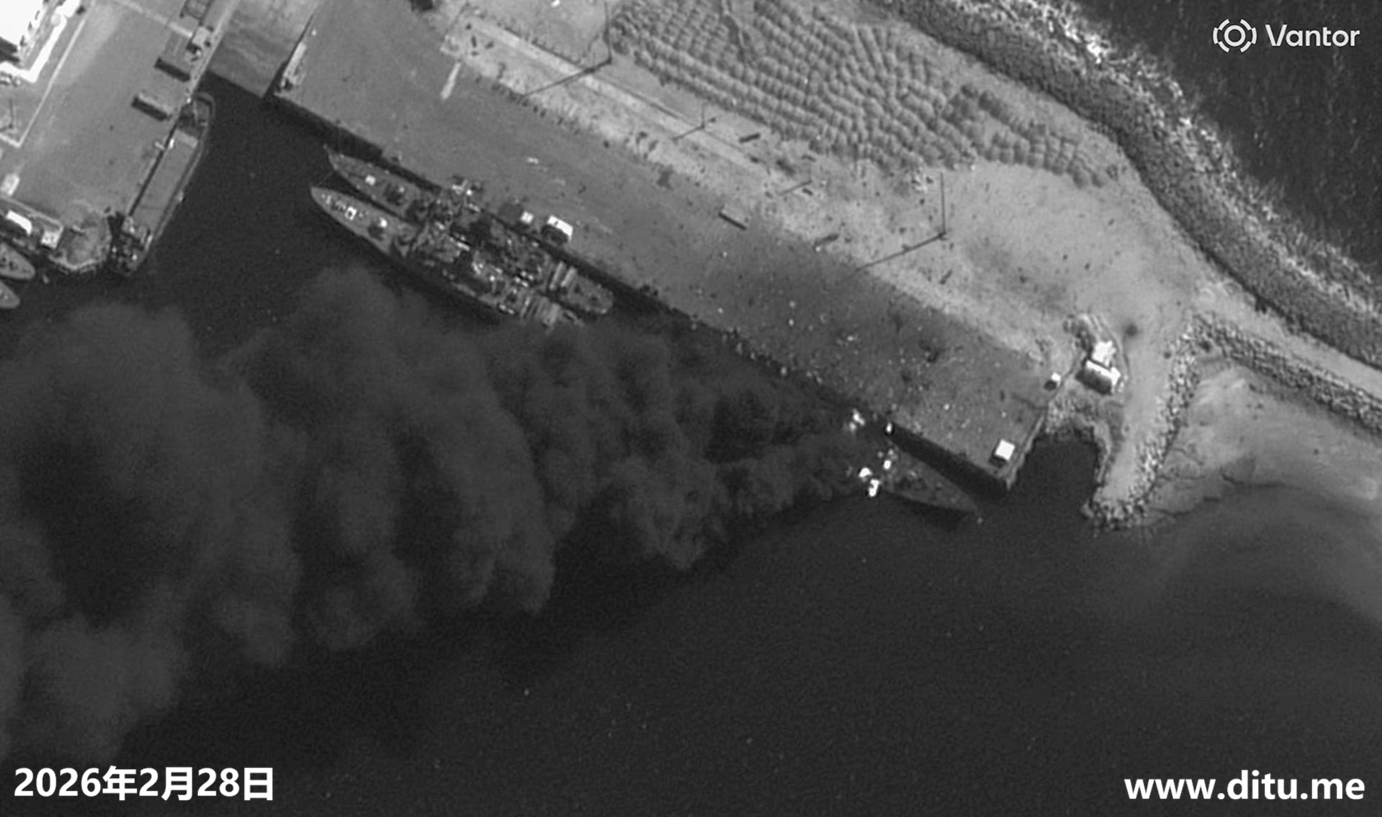2026美国、以色列与伊朗战争相关卫星影像合集(持续更新ing) 时间: 2026-03-03 分类: 地图资料 停靠在伊朗科纳拉克海军基地的军舰遭到袭击起火爆炸,冒出滚滚浓烟。被摧毁的储藏掩体,地点是伊朗科纳拉克。被摧毁的战斗机库掩体,地点是伊朗科纳拉克。阿联酋迪拜棕榈岛附近的杰贝阿里港,因拦截导弹的碎片引发火灾,浓烟滚滚。