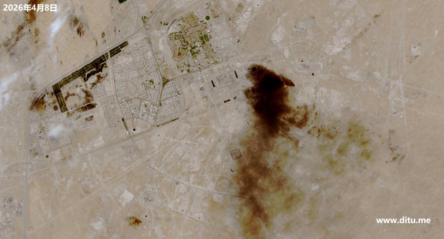 2026年4月8日,位于沙特阿布盖格(Abqaiq)的一处沙特阿美(Saudi Aramco)石油设施遭到袭击,卫星图像显示现场浓烟滚滚。