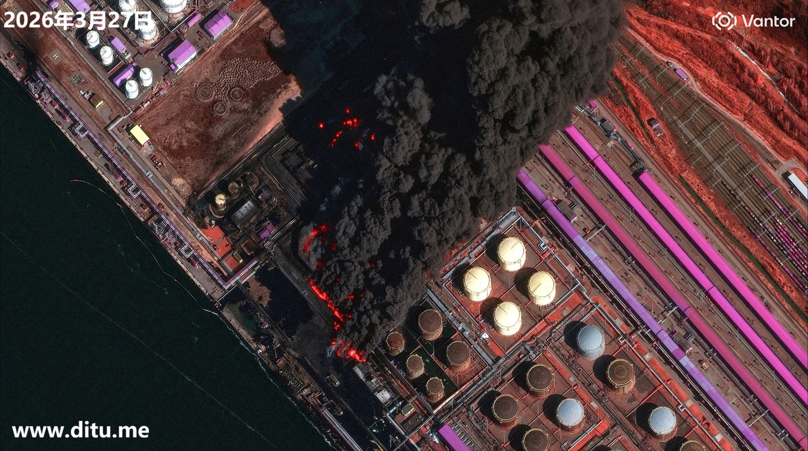 俄罗斯乌斯季卢加港遇袭的卫星影像 时间: 2026-04-02 分类: 地图资料 卫星图像拍摄时间:2026年3月27日。2026年3月27日,地处波罗的海的俄罗斯港口乌斯季-卢加在遭受乌克兰袭击后,升起了大量浓烟。