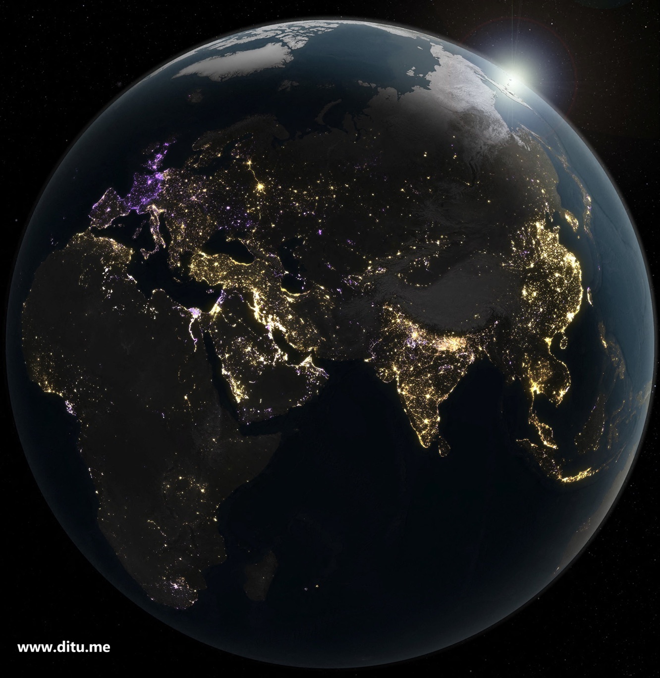 地球夜间卫星影像 时间: 2026-04-09 分类: 地图资料 这幅发布于2026年4月8日的图像中,呈现了地球的夜间景象。该图像基于过去十年间每日拍摄的地球夜间卫星照片合成而成,通过捕捉人工照明所散发的光芒,生动地展现了人类在地球上的活动轨迹。