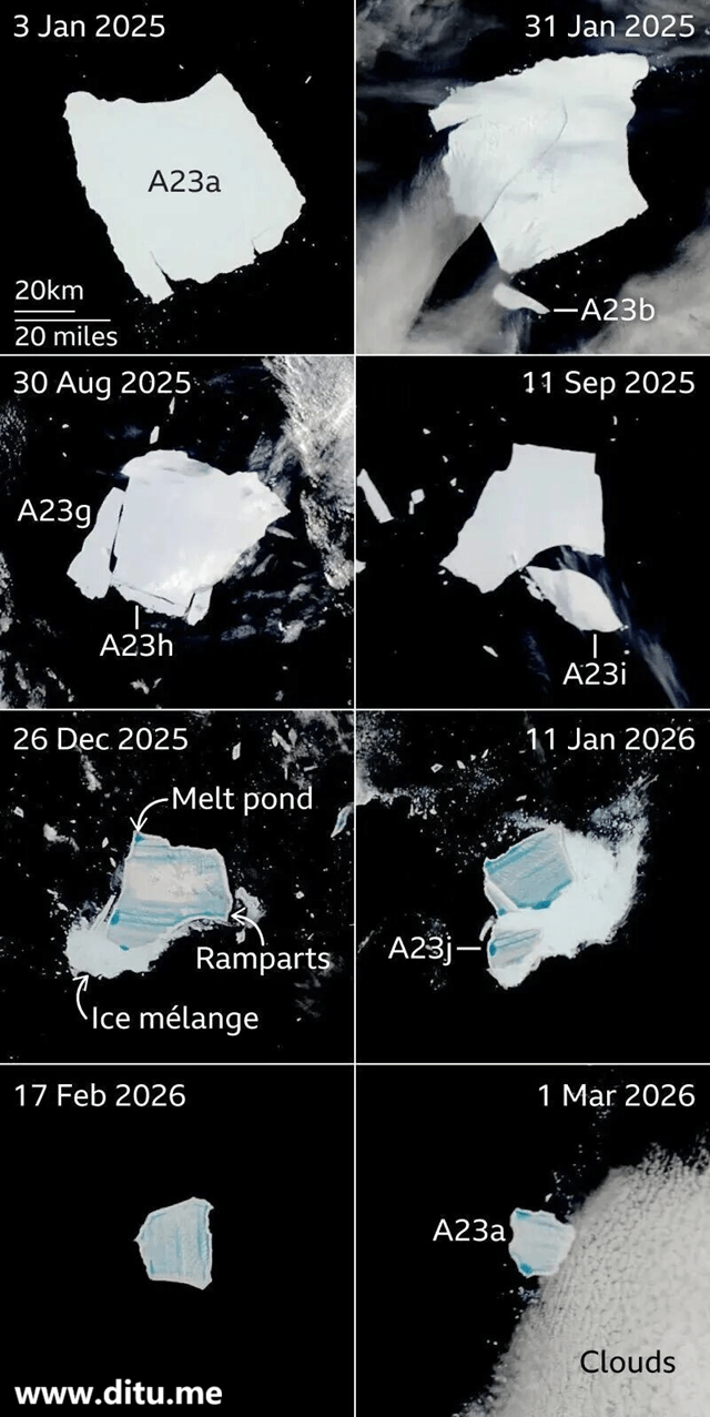 以上是A23a冰山消融末期示意卫星图(从2025年1月到2026年3月)。